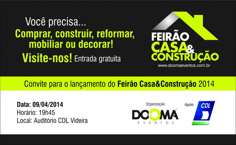Videira se prepara para receber a 2ª edição do feirão da Casa & Construção realizado pela empresa Dooma Eventos, com o apoio da Câmara de Dirigentes Lojistas (CDL) Videira. O pré-lançamento do evento acontece nesta quarta-feira (9), as 19h45 no auditório Mauro Cesar Pasqual e deve reunir expositores que participaram da primeira edição e novos empresários interessados em mostrar produtos e serviços ligados aos setores que dão nome à feira.