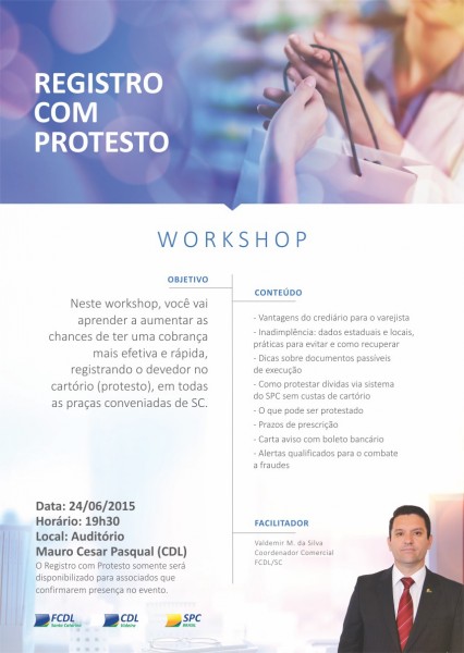 O workshop será ministrado pelo coordenador comercial da FCDL/SC – Waldemir da Silva e abordará os seguintes temas: vantagens do crediário para os varejistas; inadimplência: dados estaduais e locais, práticas para evitar e como recuperar; dicas sobre documentos passíveis de execução; como protestar dívidas via sistema do SPC sem custas de cartório, o que pode ser protestado; prazos de prescrição; carta aviso com boleto bancário e alertas qualificados para o combate a fraude.