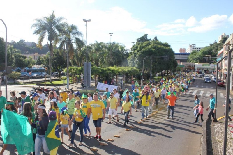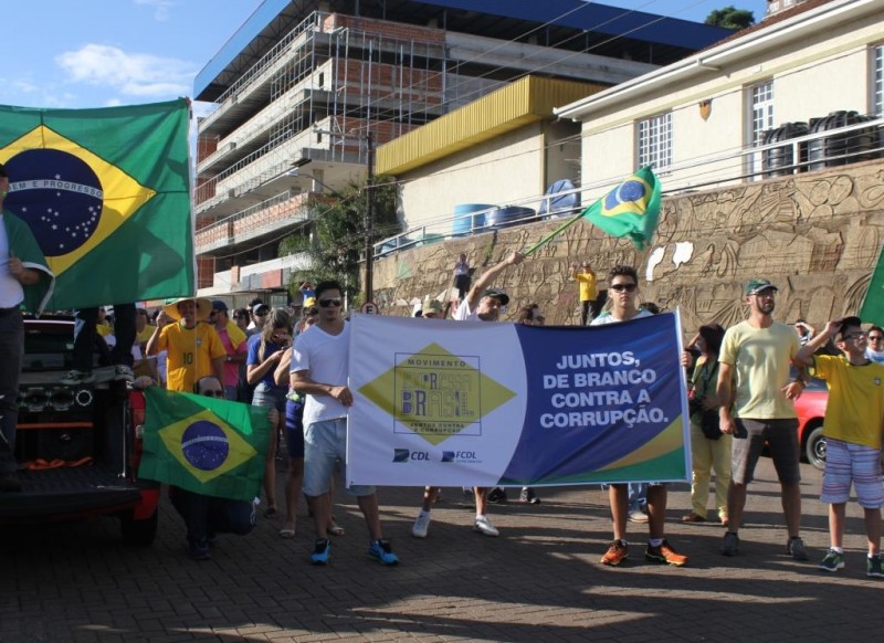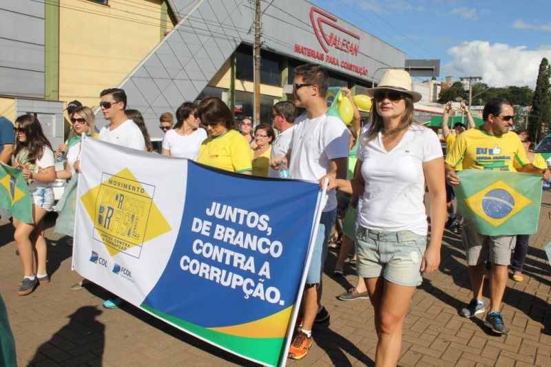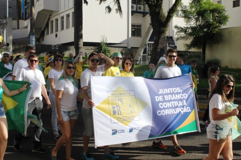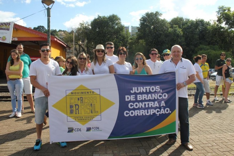 Neves participou da passeata ao lado de membros da diretoria e percorreu todo o trajeto que passou pela Rua Nicolau Cavon, XV de Novembro, D. Pedro II, Saul Brandalise, Cel. Alberto Schmitt e Rua Brasil até chegar novamente à Estação. Durante toda a caminhada os participantes entoaram o Hino Nacional e gritaram palavras de ordem. Para o presidente da CDL a participação da classe lojista foi de extrema importância porque o país vem enfrentando uma crise econômica sem precedentes e o varejo é o setor que mais sente seus reflexos, com a queda acentuada do consumo e a inadimplência crescente. Nossa principal intenção, enquanto empresários foi chamar a atenção do Governo Federal, bem como da Câmara Federal e Senado para acabar com a corrupção em todos os âmbitos, além de promoverem a reforma tributária, o enxugamento e modernização da máquina administrativa, além da não criação ou retorno de impostos e taxas que visem onerar ainda mais o setor empresarial e o consumidor.