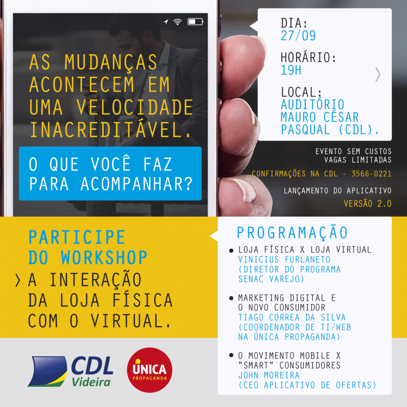 Acompanhar as mudanças no varejo atual e adaptar-se as necessidades do consumidor é de extrema importância para manter-se ativo e lucrativo nos dias atuais. É nesse sentido que a CDL Videira e a Única Propaganda oferecem gratuitamente no dia 27 de setembro o Workshop “Interação entre a loja física e virtual”. Não fique de fora! É gratuito!