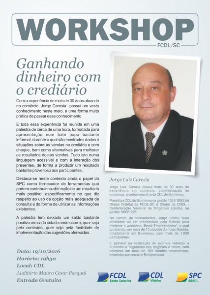 Segundo o presidente da CDL Videira – José das Neves Olivo, o workshop é gratuito para os associados e tem como objetivo orientar e capacitar o lojista através de soluções provenientes da gestão do crédito, tendo como foco a avaliação de risco de cheque e crediário. Na oportunidade Caresia ainda apresentará ferramentas fundamentais para o auxílio no momento da análise de crédito. “A palestra tem provocado efeitos muito positivos onde é ministrada, quer seja pelo conteúdo, quer seja pela facilidade de implementação das sugestões apresentadas pelo palestrante, por isso, fizemos questão de articular a vinda desse treinamento para Videira”, diz Olivo.