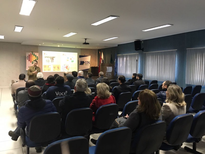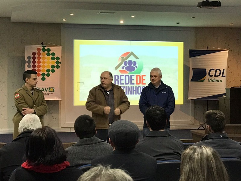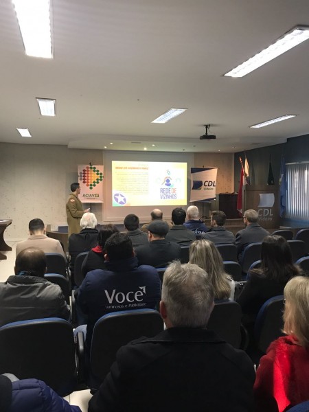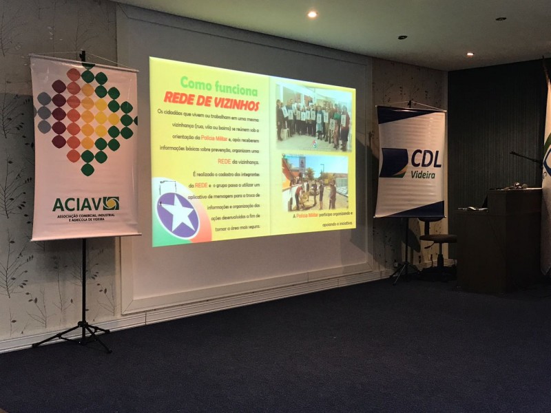 O auditório Mauro Cesar Pasqual da CDL Videira sediou na manhã desta quarta-feira (19), a reunião de apresentação do Projeto Rede de Vizinhos desenvolvido pela Polícia Militar de Santa Catarina para que em conjunto com comerciantes e moradores haja prevenção de crimes e ou delitos na cidade. A iniciativa reuniu associados da CDL e da ACIAV que receberam informações do comandante da PM de Videira, tenente Ricardo Silva de Souza. Os presidentes das duas entidades, José das Neves Olico (CDL) e Vilson Giazzoni (ACIAV) também acompanharam a apresentação.