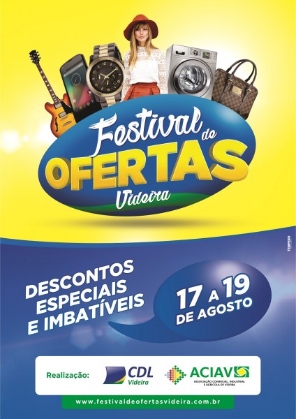 De 17 a 19 de agosto o comércio de Videira sediará um dos maiores festivais de ofertas, promoções e descontos que a região já viu. De quinta-feira a sábado da próxima semana, as duas principais entidades representativas do comércio e da indústria de Videira: CDL e ACIAV realizam o 1º Festival de Ofertas de Videira. Serão mais de 60 lojas associadas e identificadas com a logomarca da Campanha, unidas para promover uma das maiores promoções coletivas da região.