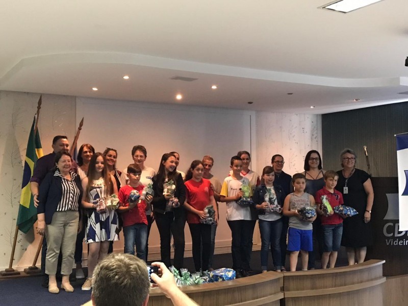O auditório Mauro Cesar Pasqual, da CDL Videira recebeu nesta segunda-feira (19), para a cerimônia de premiação, os alunos vencedores da etapa municipal e os alunos destaques da 8ª edição do Concurso Recicla CDL na Escola. O evento foi prestigiado pela diretora cultural da CDL, Ivonete Zani, pela vice-prefeita Claudete Vavassori, pelo secretário municipal de Educação, Giancarlo Farinon, a representante do Sicoob Videira, Claudete Zornita Ciota, além da diretora pedagógica da Secretaria de Educação, Mara Lucia Sechi Mezzaroba, da secretária executiva da CDL, Larissa Seemann Perondi, pais professores e diretores.