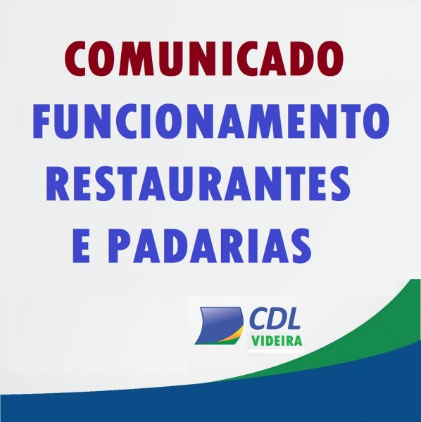 Seguindo orientação do Governo do Estado e da Polícia Militar de Videira, a CDL, com base no Decreto Estadual Nº 515, assinado pelo Governador Carlos Moisés, em 17 de março de 2020, para enfrentamento da pandemia decorrente do Coronavírus, reforça comunicado no que diz respeito ao funcionamento específico de restaurantes e padarias:
