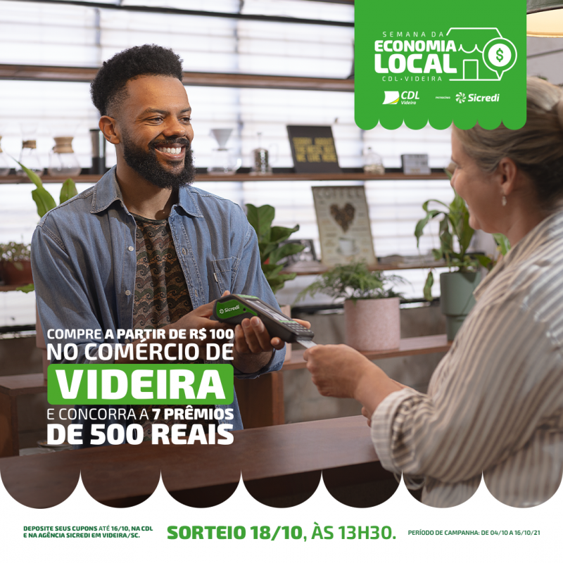 Sempre em busca de alternativas para tornar nosso comércio ativo e atrativo, a CDL Videira acaba de firmar uma parceria incrível com o SICREDI para promover a Campanha SEMANA DA ECONOMIA LOCAL CDL/SICREDI. A mobilização que inicia na próxima segunda-feira, 04 de outubro e segue até o dia 16, vai sortear entre os consumidores que realizarem compras neste período, sete cadernetas de poupança SICREDI, no valor de R$ 500,00 (quinhentos reais), cada, totalizando R$ 3.500,00 em prêmios.