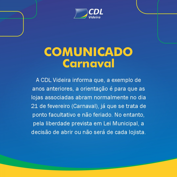 Atenção para a orientação da CDL referente ao funcionamento do comércio no período do Carnaval.