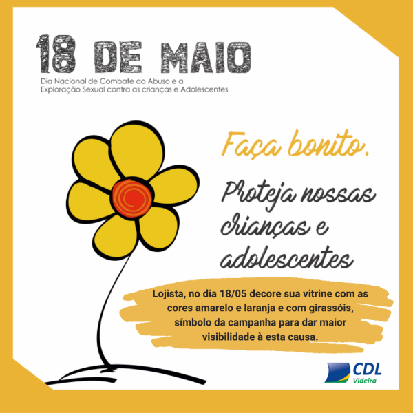 ➡️Prezado associado da Câmara de Dirigentes Lojistas (CDL) Videira, no próximo dia 18 de maio, nosso país celebra o Dia Nacional de Combate ao Abuso e à Exploração Sexual de Crianças e Adolescentes e, nós podemos ajudar a dar visibilidade para essa causa tão importante.