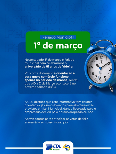 Confira a orientação da CDL para o feriado municipal de 1° de Março